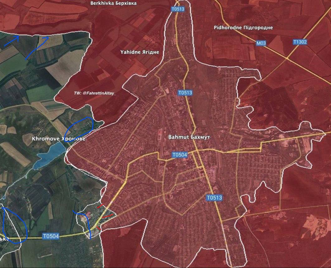 Ряд российских телеграм-каналов публикуют карту Бахмута, согласно которой Украина удерживает юго-западную окраину города (где и находился самолёт).