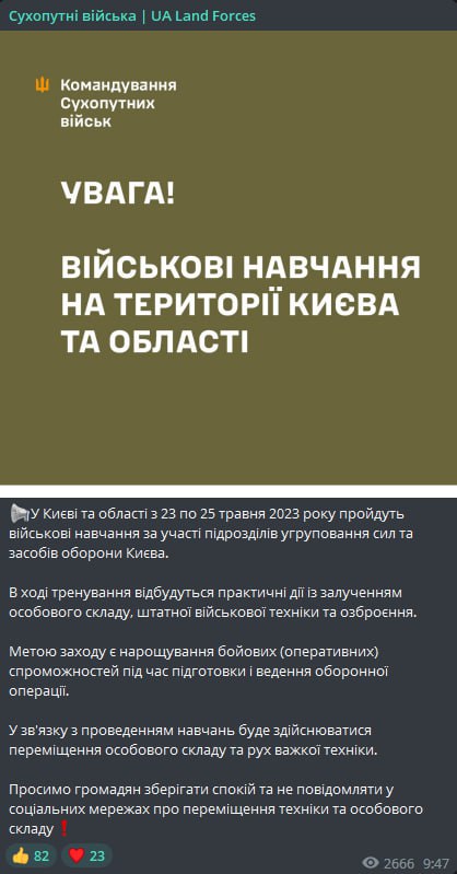 В Киеве и области с сегодняшнего дня, 23 мая, и по 25 мая пройдут военные учения с участием подразделений группировки сил и средств обороны столицы.