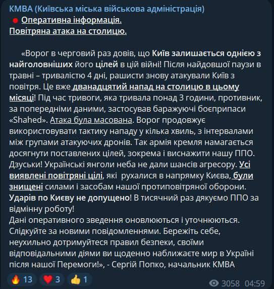 Сегодня ночью после четырехдневной паузы Киев снова атаковали дронами. Все цели были уничтожены силами ПВО. По предварительным данным, применялись "Шахиды".