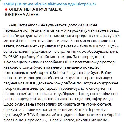 По данным Киевской городской военной администрации, предварительно РФ атаковала крылатыми ракетами типа Х-101/555, запущенными из района Каспийского моря.