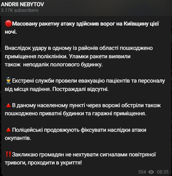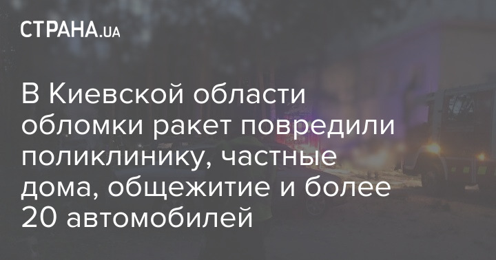 Сегодня ночью в результате ракетной атаки по Киевской области в одном из районов повреждено помещение поликлиники. Обломки ракеты обнаружили также недалеко от роддома.