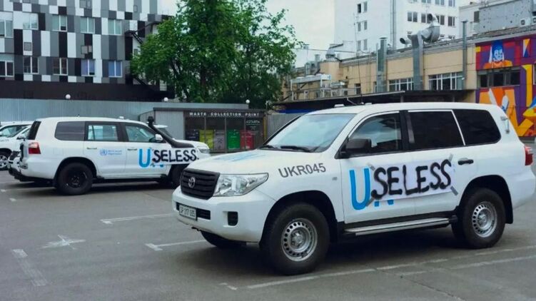 В сети появились фото, как утверждается, разрисованных автомобилей ООН на парковке в Киеве. На дверях автомобилей прикреплена скотчем надпись "Бесполезные". Она обыгрывает первую букву в названии организации - UN.