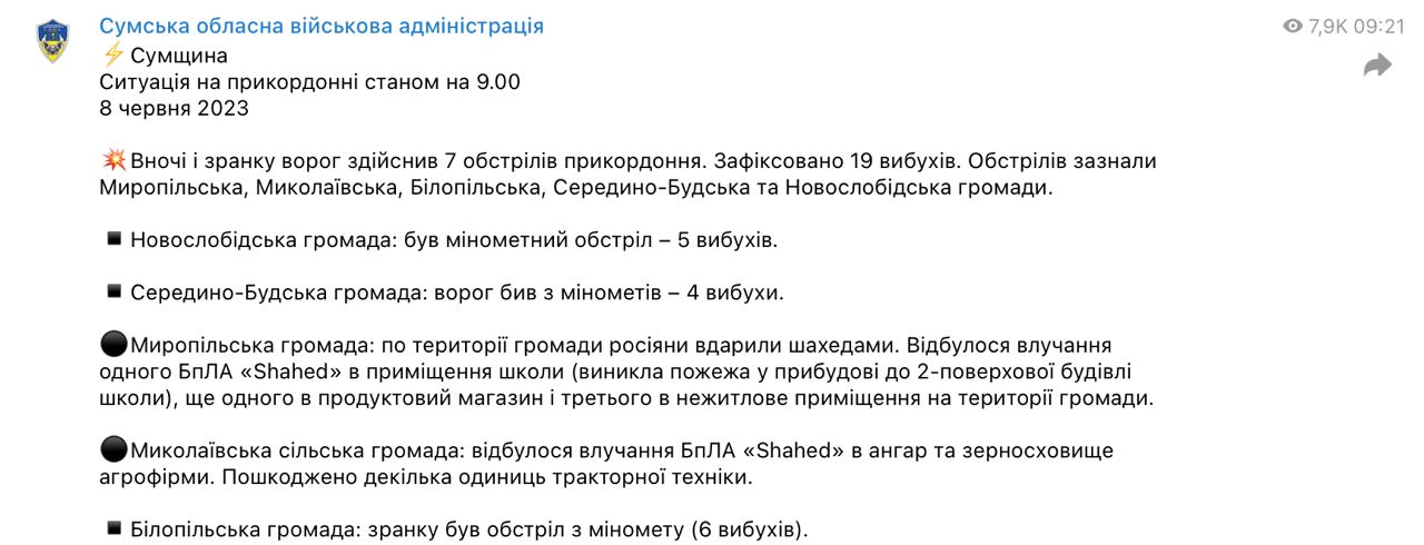 В четверг, 8 июня, РФ атаковала с помощью "Шахедов" Сумскую область. Также были обстрелы из минометов.