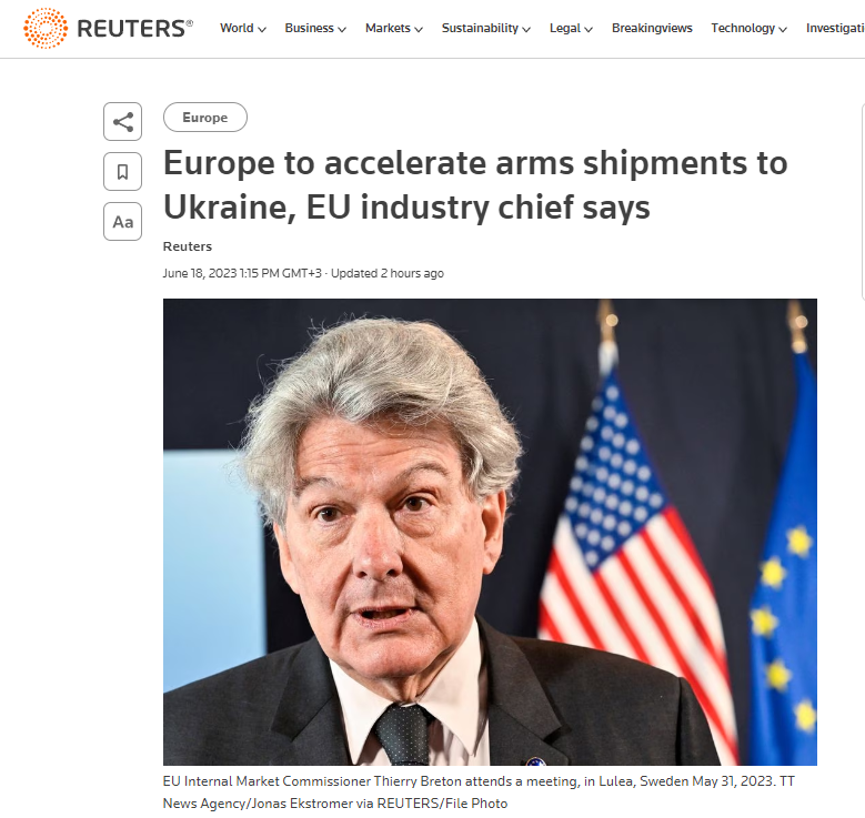 Еврокомиссар по вопросам внутренней политики и военной промышленности Тьерри Бретон заявил, что для поддержки контрнаступления Вооруженных сил Украины Евросоюз планирует ускорить поставки оружия Киеву.