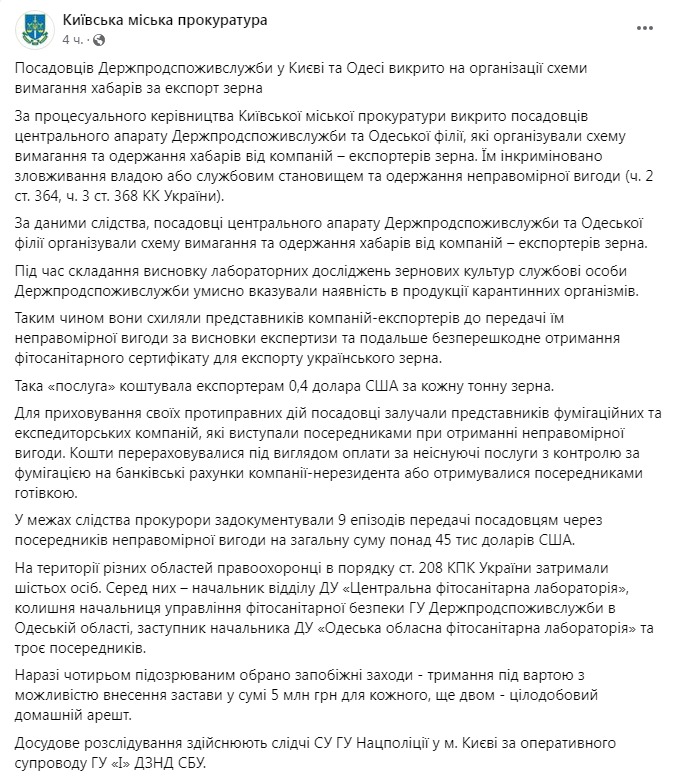 Чиновники вымогали немалые деньги у продавцов зерна. Фото: facebook.com/kyiv.gp.gov.ua