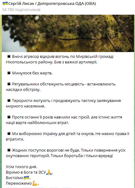 07.35 Ночью РФ из тяжелой артиллерии обстреляла Мировскую громаду Никопольского района Днепропетровской области.