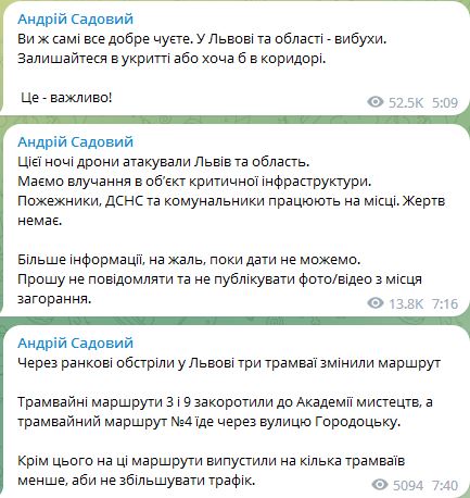 Также из-за утренних обстрелов во Львове три трамвая сменили маршрут. Трамвайные маршруты 3 и 9 были сокращены до Академии искусств, а трамвайный маршрут №4 едет через улицу Городоцкую.