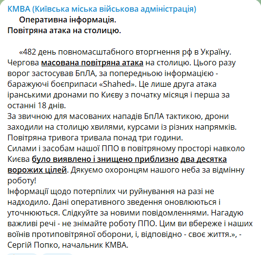 "На этот раз враг применил БПЛА, по предварительной информации – баражирующие боеприпасы "Шахед". Это лишь вторая атака иранскими дронами по Киеву с начала месяца и первая за последние 18 дней", - сообщил глава городской военной администрации Сергей Попко.