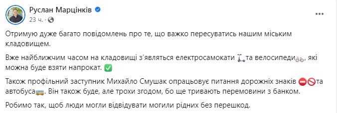 "Получаю очень много сообщений о том, что трудно передвигаться по нашему городскому кладбищу. Уже в ближайшее время на кладбище появятся электросамокаты и велосипеды, которые можно будет взять напрокат. Также профильный заместитель Михаил Смушак прорабатывает вопросы дорожных знаков и автобуса. Он также будет, но немного погодя, потому что еще продолжаются переговоры с банком", - сказано в посте.