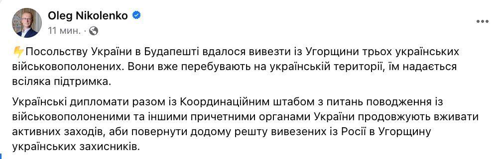 "Украинские дипломаты вместе с Координационным штабом по вопросам обращения с военнопленными и другими причастными органами Украины продолжают применять активные меры, чтобы вернуть домой остальных вывезенных из России в Венгрию украинских защитников", — добавил Николенко.