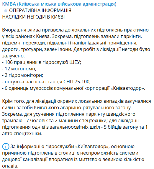По информации гидрослужбы "Киевавтодор", основной причиной подтоплений в столице есть неспособность системы дождевой канализации справиться с мгновенным обилием осадков.