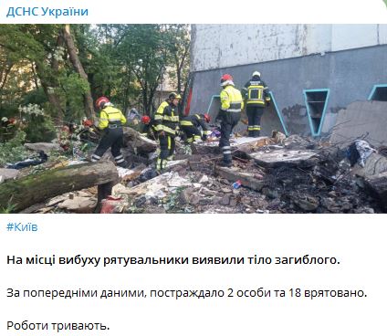 07.22 Во время проведения спасательных работ на месте взрыва в Киеве было выявлено тело одного погибшего.