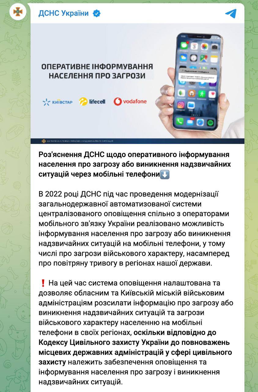 "В 2022 году ГСЧС при проведении модернизации общегосударственной автоматизированной системы централизованного оповещения совместно с операторами мобильной связи Украины реализована возможность информирования населения об угрозе или возникновении чрезвычайных ситуаций на мобильные телефоны, в том числе об угрозах военного характера, прежде всего о воздушной тревоге в регионах нашей государства. В настоящее время система оповещения настроена и позволяет областным и Киевской городской военным администрациям рассылать информацию об угрозе или возникновении чрезвычайных ситуаций и угрозах военного характера населению на мобильные телефоны в своих регионах, поскольку в соответствии с Кодексом гражданской защиты Украины к полномочиям местных государственных администраций в сфере гражданского защите принадлежит обеспечение оповещения и информирования населения об угрозе и возникновении чрезвычайных ситуаций", - сказано в посте госслужбы.