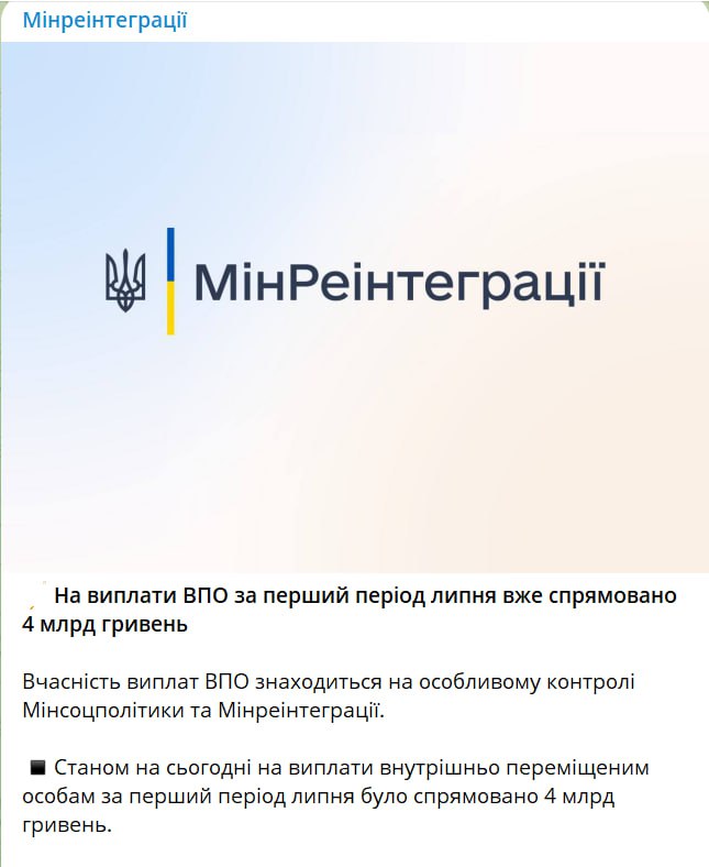 На выплаты временно перемещенным лицам за первый период июля направлено 4 млрд гривен.