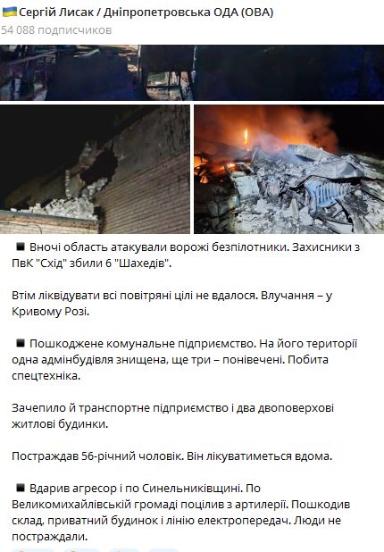 Ликвидировать все воздушные цели не удалось. Попадание – в Кривом Роге. Повреждено коммунальное предприятие. На его территории одно админздание уничтожено, еще три – повреждены. Пострадала спецтехника.