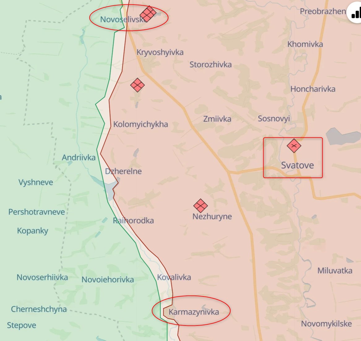 Упомянутое Анной Маляр Новоселовское находится юго-восточнее Купянска, прямо на трассе Купянск - Сватово. По данным украинских военных пабликов, на это село также идут непрерывные атаки. Ряд российских военных пабликов пишут, что оно уже взято армией РФ, другие - что за него до сих пор идут бои.