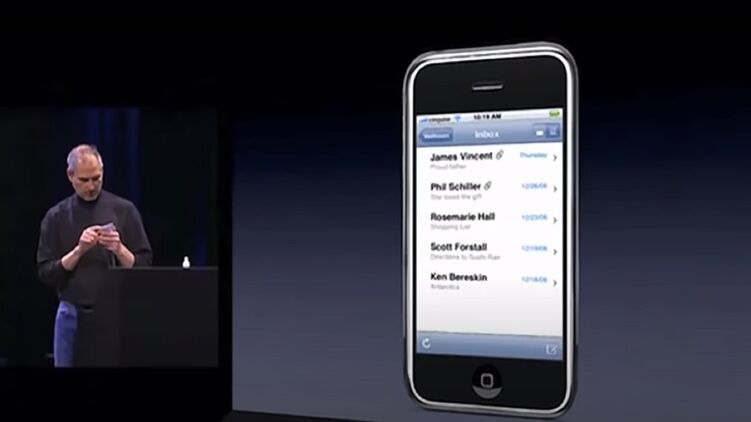 Стив Джобс представляет айфон первого поколения в 2007 году. Скриншот видео