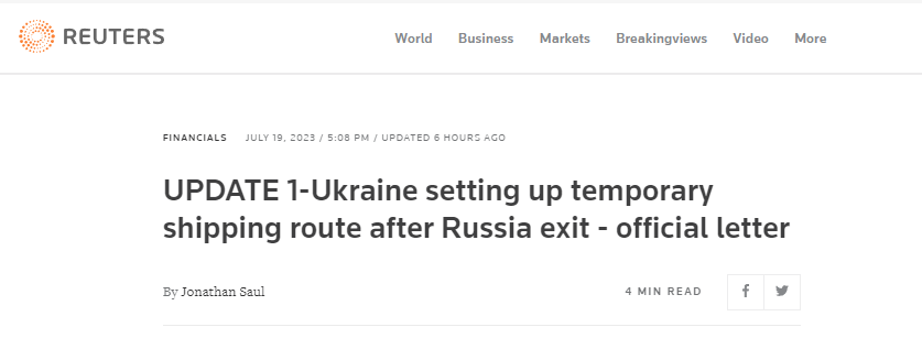 Напомним, сегодня российское Минобороны заявило, что с 20 июля все суда, следующие в акватории Черного моря в украинские порты, будут рассматриваться им как потенциальные перевозчики военных грузов. Страны флага таких судов будут считаться Москвой вовлеченными в войну на стороне Украины, говорится в заявлении.