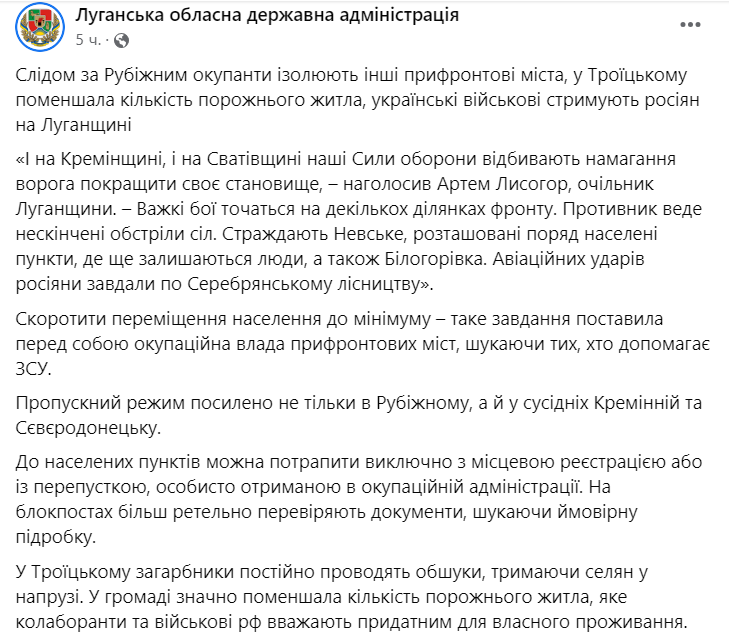 "Сократить перемещение населения к минимуму – такую задачу поставили перед собой захватнические власти прифронтовых городов, ищут тех, кто помогает Вооруженным силам Украины. Пропускной режим усилен не только в Рубежном, но и в соседних Кременной и Северодонецке", – говорится в сообщении.