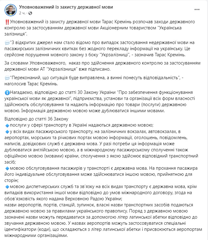 "Из открытых источников нам стало известно о случае применения негосударственного языка на пассажирских железнодорожных билетах без перевода информации на украинский. Это серьезное нарушение языкового закона со стороны "Укрзализныци", - написал Креминь.