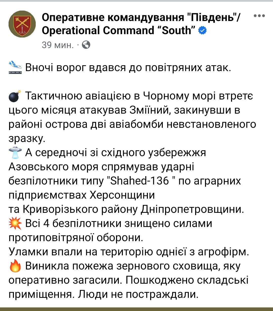 Что касается "Шахедов", то они смогли поджечь зернохранилище. Пожар уже ликвидирован.