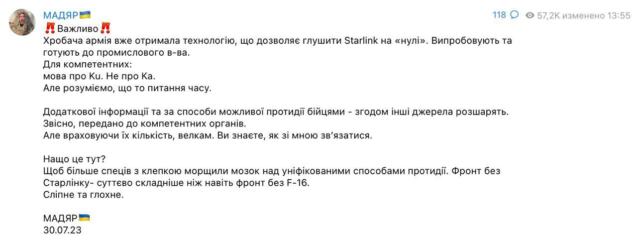 14:35 Украинский военный с позывным Мадьяр заявляет, что российская армия уже получила технологию, позволяющую глушить Starlink на фронте.