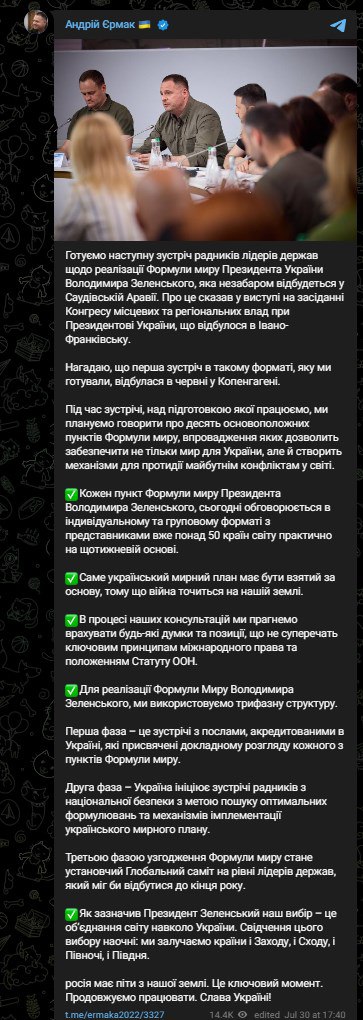 О мероприятии Ермак написал в своем телеграм-канале.