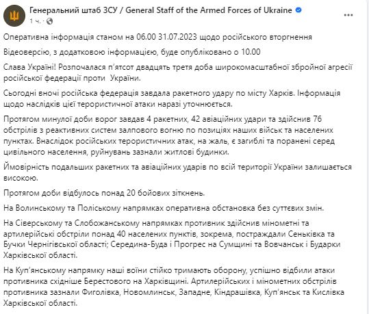 В понедельник, 31 июля, Генштаб ВСУ обнародовал сводку о ситуации на фронте.