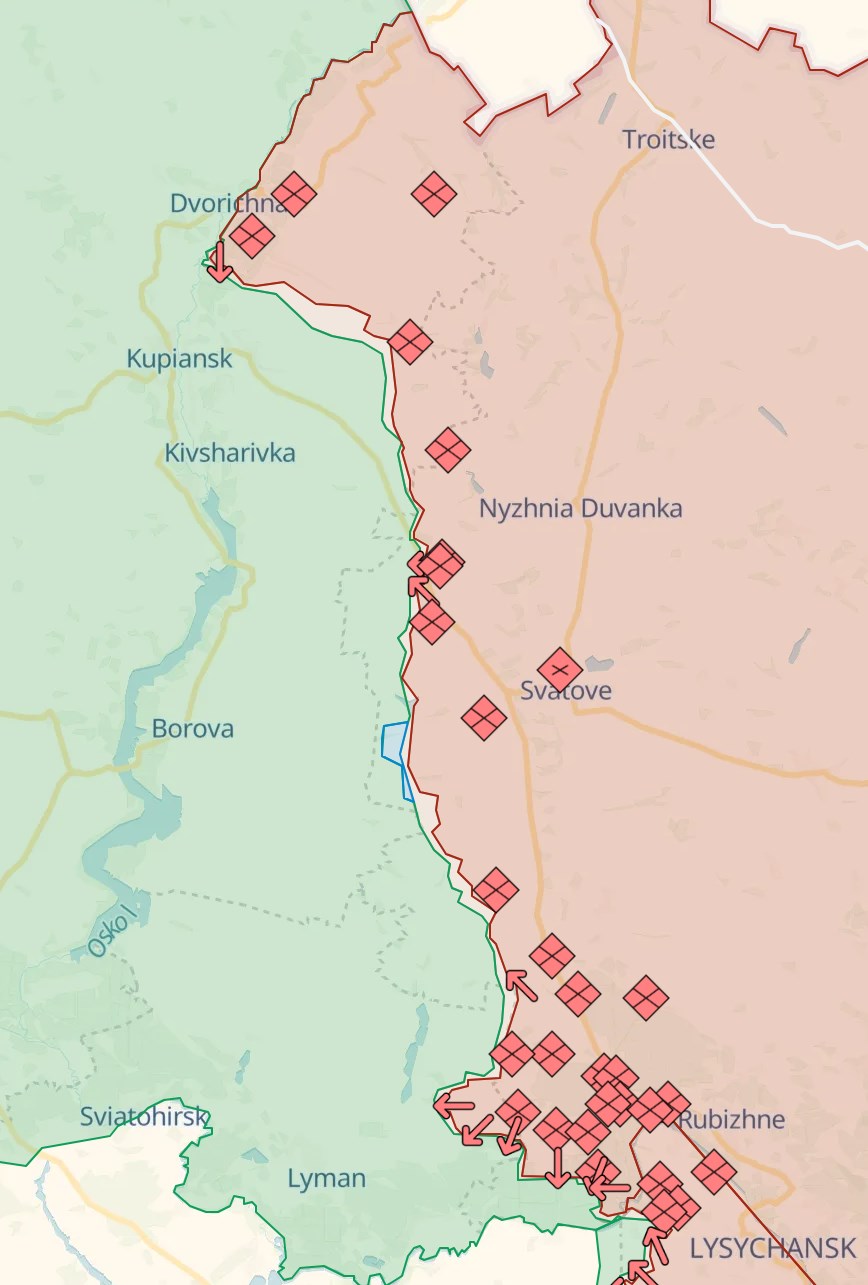Российские паблики пишут, что фронт в Лиманском направлении стабилизировался, поскольку ВСУ бросили туда резервы. Ближе к Сватово основные бои идут за Новоселовское. Также россияне продолжают оказывать давление северо-восточнее Купянска.