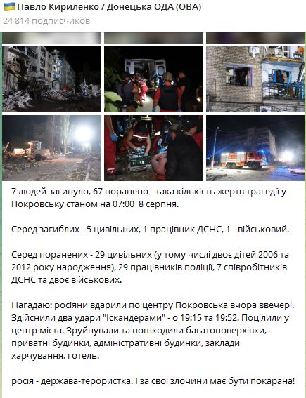 На это утро известно о 67 раненых после удара по Покровску в Донецкой области.