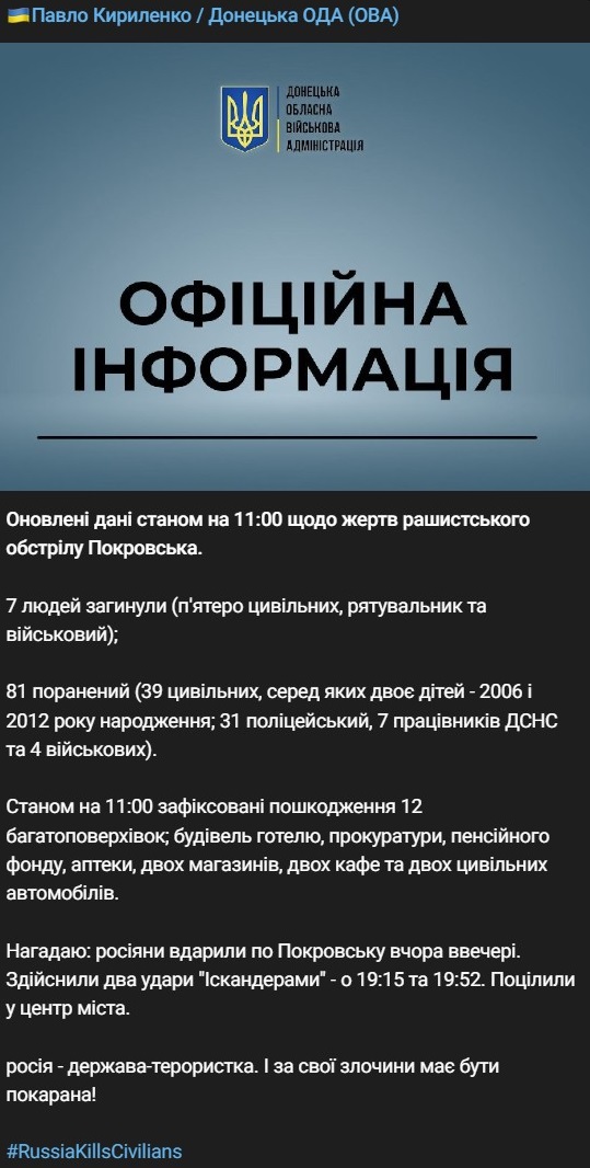 Напомним, россияне ударили по Покровску вчера вечером. Совершили два удара "Искандерами" - в 19:15 и 19:52.