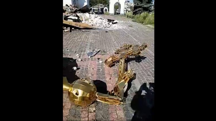 На кадрах можно увидеть проломленную крышу одноэтажных сооружений на заднем плане и полностью уничтоженное здание церкви. У ног оператора лежит деформированный золочёный купол и согнутый по центру православный крест, упавшие на землю с крыши храма. Также заметны ещё несколько построек на прилегающей территории, которым посчастливилось уцелеть в большей степени: на них остались купола, увенчанные крестами.