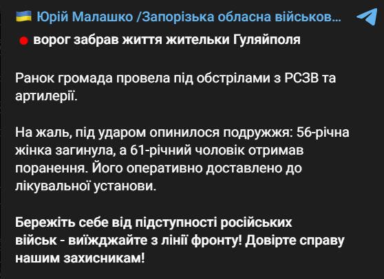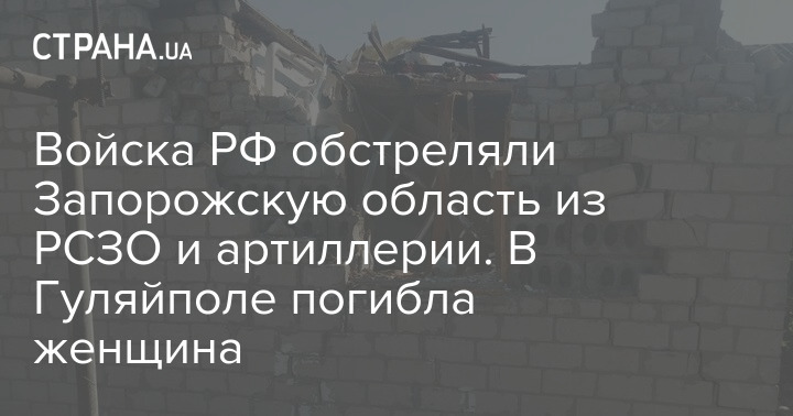 Сегодня утром оккупанты в очередной раз обстреляли Запорожскую область из РСЗО и артиллерии. Из-за обстрела в Гуляйполе погибла женщина.
