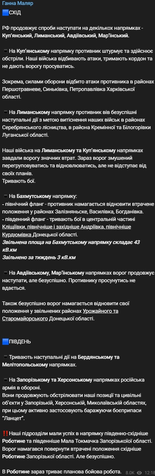 Замминистра обороны Украины Анна Маляр заявила о продвижении ВСУ юго-восточнее Работино на Ореховском направлении.
