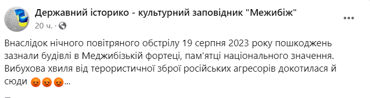 В Хмельницкой области в результате обстрелов 19 августа повреждена Меджибожская крепость XIV-XVI века. Взрывной волной повреждены окна, двери и кровля Рыцарской башни.