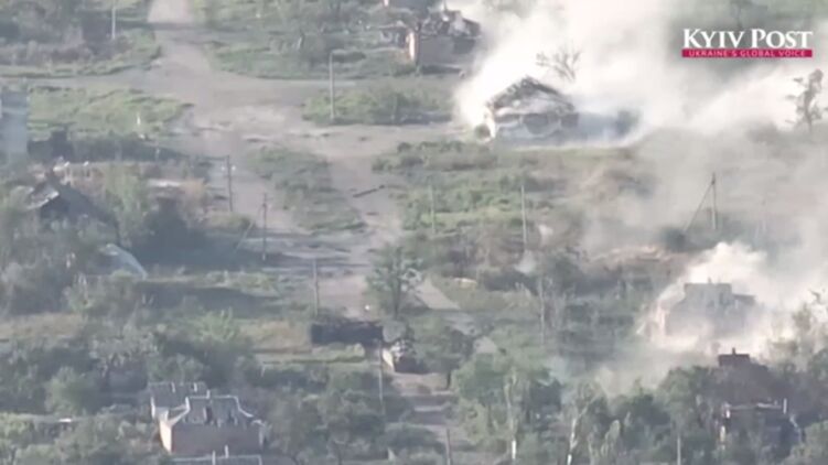 На видео можно заметить, как украинские танк и БМП ведут огонь по позициям россиян в селе. Под конец видео по ним также открывается огонь. Как говорится в описании, БМП уезжает после этого на большой скорости.