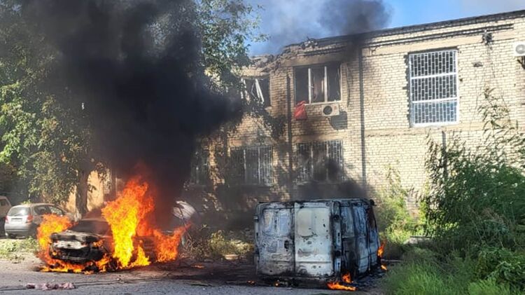 Еще один боеприпас попал в административное здание, возле которого загорелись два автомобиля.