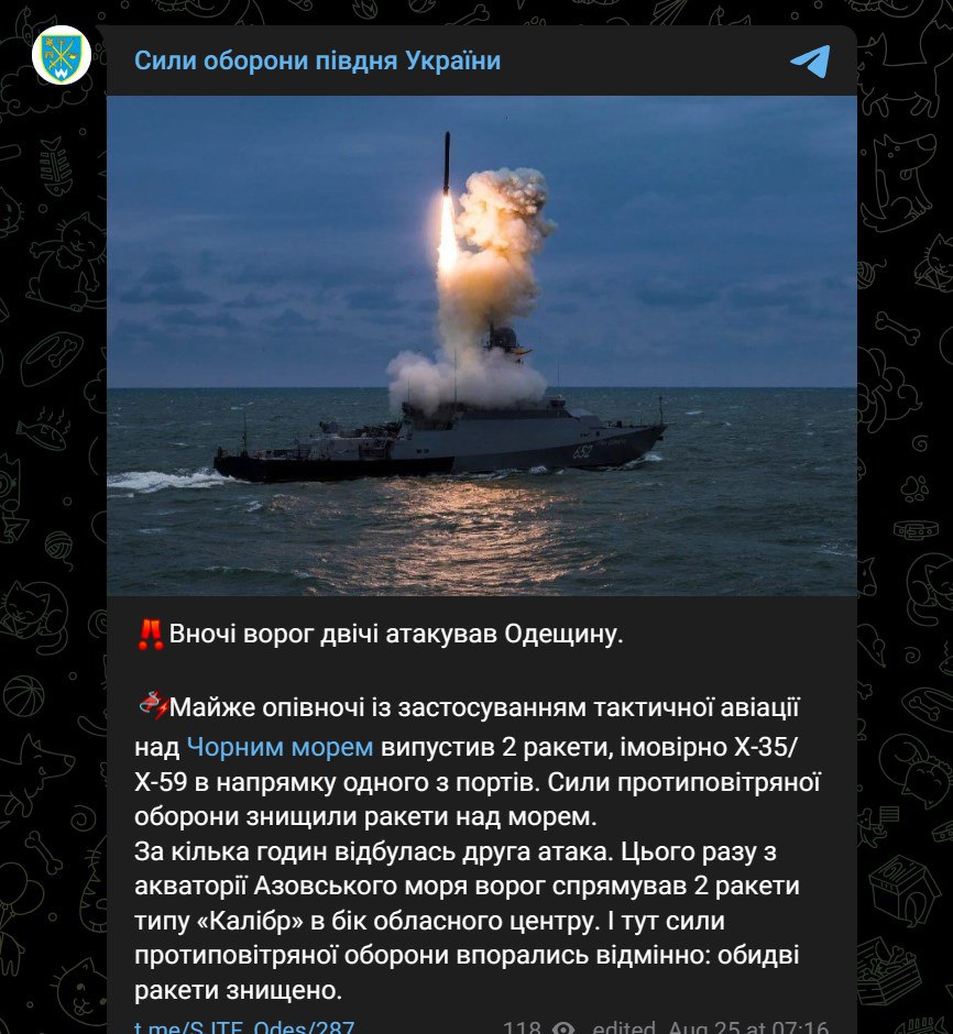 Через несколько часов из акватории Азовского моря вылетели два "Калибра" в сторону Одессы. Оба также были уничтожены.