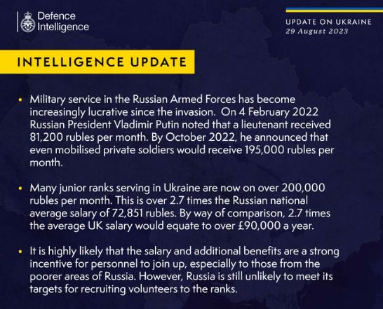 Как пишет британская разведка, младшие чины, воюющие в Украине, получают более 200 тысяч рублей в месяц, что в 2,7 раза выше средней зарплаты в РФ.