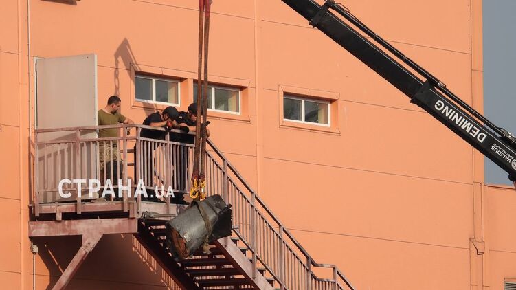 Фото и видео обломков сбитой ракеты, которые взрывотехники достают из "Ашана" в Дарницком районе Киева.