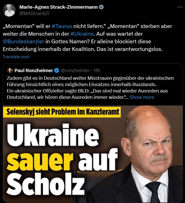 "В данный момент он не хочет поставлять Taurus. "В данный момент" - но в Украине продолжают гибнуть люди. Чего же ждет канцлер Шольц, во имя Бога? Он один блокирует это решение внутри коалиции. Это безответственно", - написала Штрак-Циммерман.