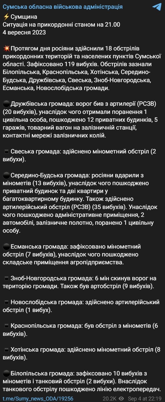 07:15 В течение минувшего дня россияне совершили 18 обстрелов приграничных территорий и населенных пунктов Сумской области. Зафиксировано 119 взрывов. Обстрелы потерпели Белопольская, Краснопольская, Хотинская, Середино-Будская, Дружбовская, Свесская, Зноб-Новгородская, Эсманская, Новослободская громады.