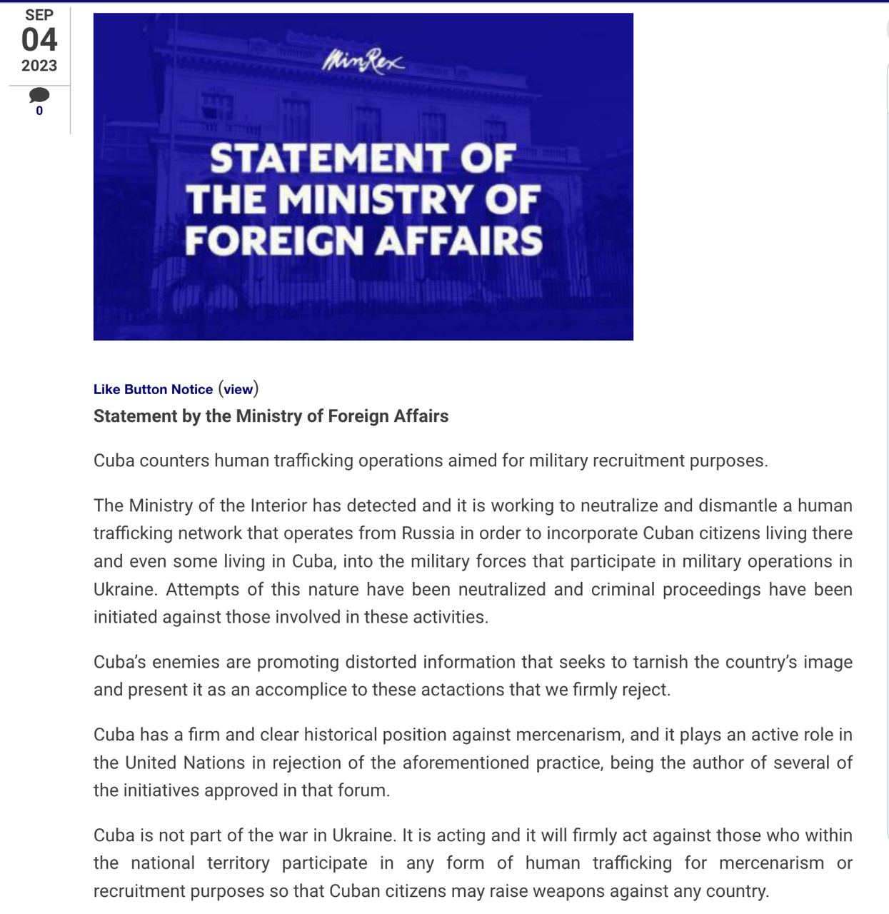 "Куба не участвует в войне в Украине. Она действует и будет решительно действовать против тех, кто на территории страны участвует в любой форме торговли людьми в целях наемничества или вербовки, чтобы кубинские граждане могли поднять оружие против любой страны", - говорится в заявлении.