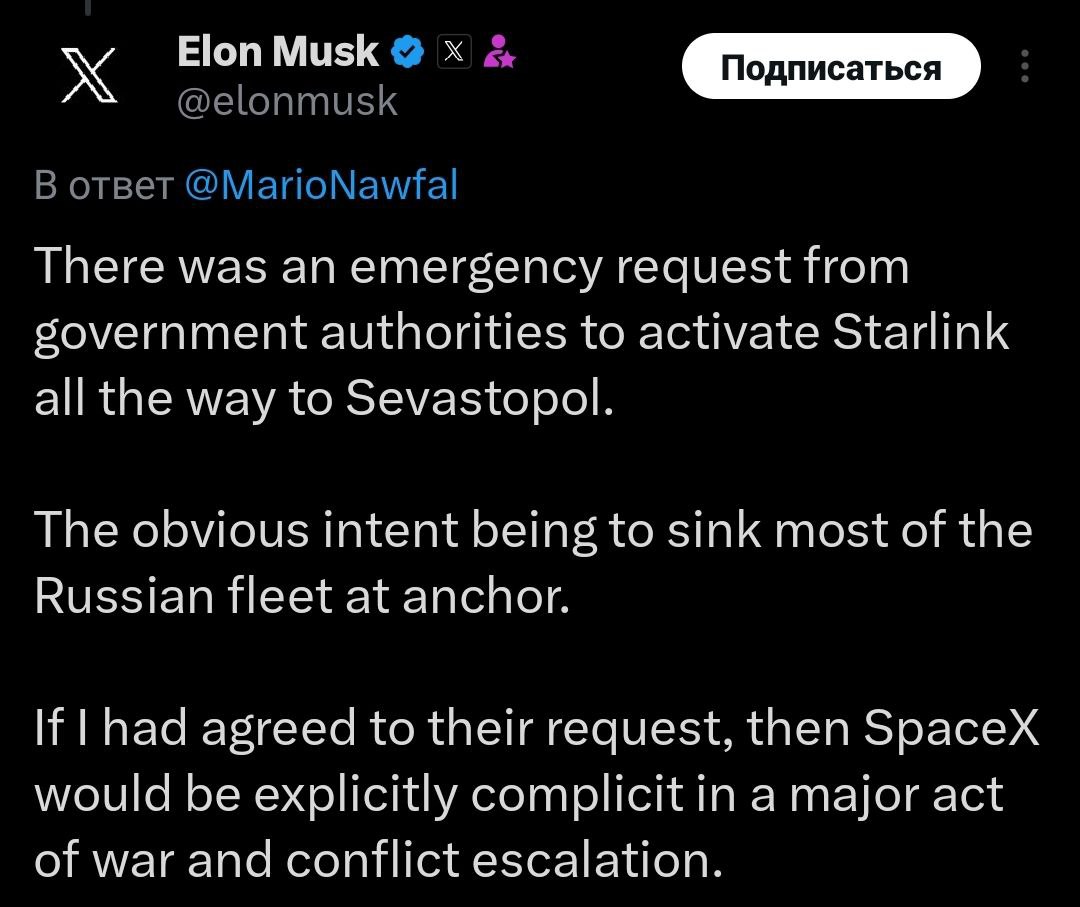 Если бы я согласился на их просьбу, то SpaceX была бы явно замешана в крупном акте войны и эскалации конфликта", - рассказал Илон Маск.
