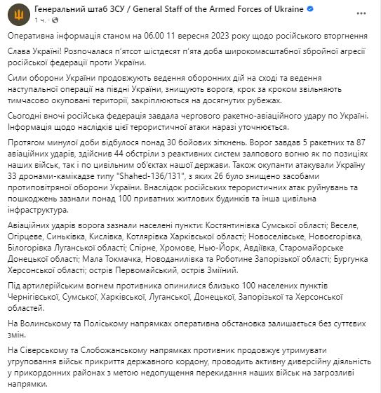 Утром 11 сентября Генштаб ВСУ обнародовал сводку о ситуации на фронте.