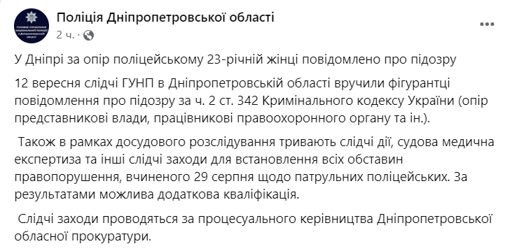 В Днепре предъявили подозрение за сопротивление сотрудникам правоохранительных органов женщине, которая находилась в автомобиле вместе с мужчиной, застреленным 29 августа патрульным.