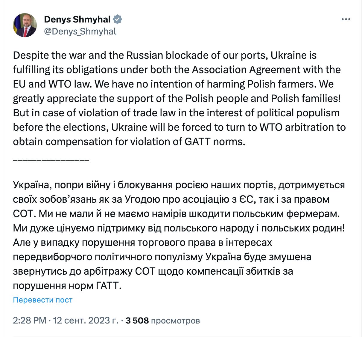 "В случае нарушения торгового права в интересах предвыборного политического популизма Украина будет вынуждена обратиться в арбитраж ВТО по поводу компенсации ущерба за нарушение норм ГАТТ (Генерального соглашения по тарифам и торговле)", - написал премьер в соцсети Х.