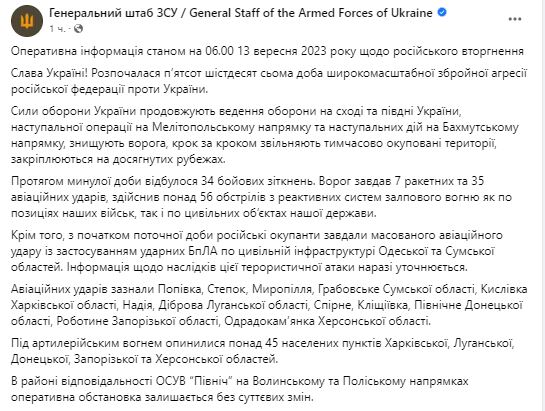 Утром 13 сентября Генштаб ВСУ обнародовал сводку о ситуации на фронте.