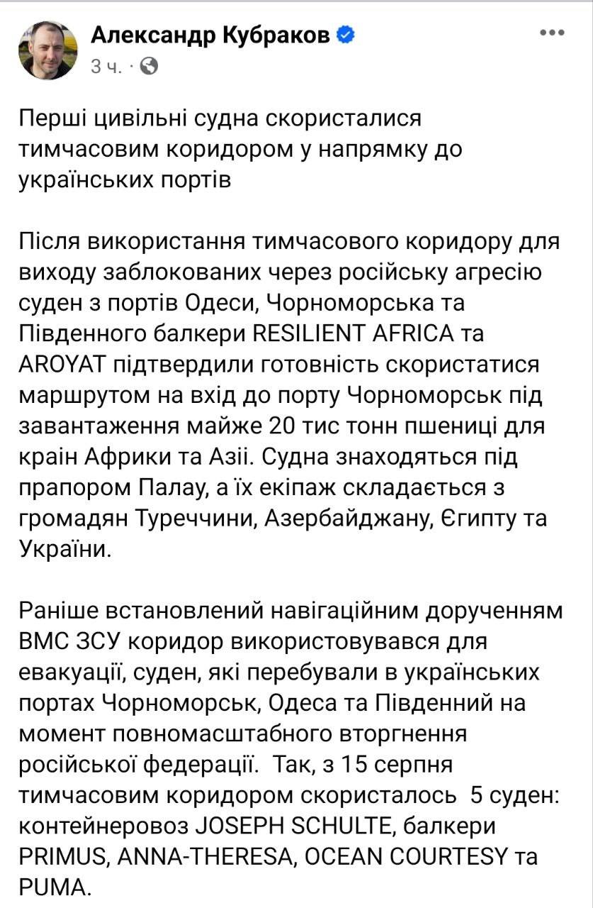 "Первые гражданские суда воспользовались временным коридором по направлению к украинским портам. После использования временного коридора для выхода заблокированных из-за российской агрессии судов из портов Одессы, Черноморска и Южного, балкеры Resilient Africa и Aroyat подтвердили готовность воспользоваться маршрутом на вход в порт Черноморск под загрузку почти 20 тысяч тонн пшеницы для стран Африки и Азии. Суда находятся под флагом Палау, а их экипаж состоит из граждан Турции, Азербайджана, Египта и Украины", - сообщает министр.