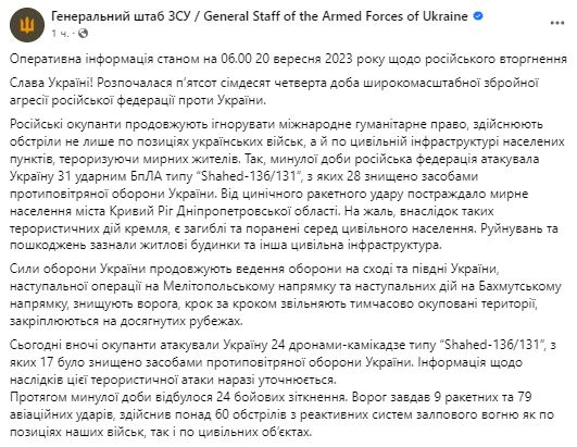 Что происходит на фронте 20 сентября. Сводка Генштаба ВСУ